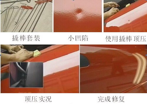 對于鋁板上的小凹陷,可以使用日照燈尋找凹陷點,再用撬棒頂壓法,從板件內(nèi)側慢慢往外頂,但要注意不能過度頂壓,如圖1-91所示為撬棒頂壓法實例圖。
