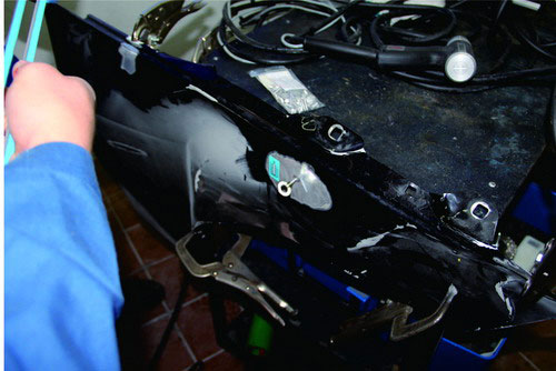 在鋁質(zhì)面板修復時,也可使用鋁整形機對損傷部位進行拉伸修復,在經(jīng)整形機修復到位后,使用專用工具將螺紋介子齊根剪下,再打磨平整即可。對于鋼板車身來說,當面板和內(nèi)層結構同時發(fā)生變形時,可以采取內(nèi)外層分離、分別修整,然后折邊咬合的修復方法。對于鋁質(zhì)面板,不能使用這種方法,否則由于鋁的韌度較差,折邊部位會出現(xiàn)裂紋或斷裂。