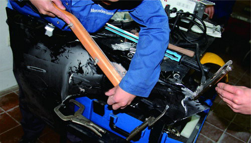 ①由于鋁板的延展性不及鋼板,在受到碰撞產(chǎn)生變形后,鋁板不容易恢復原來的尺寸。因此,對鋁板的變形應采取多次輕敲法。