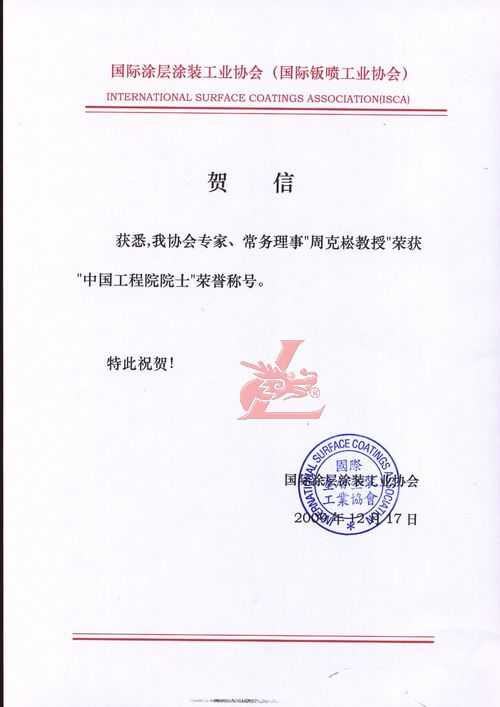 賀國(guó)際涂層涂裝工業(yè)協(xié)會(huì)專家常務(wù)理事克崧教授榮獲“中國(guó)工程院院士”[龍神秘書單位處] 賀國(guó)際涂層涂裝工業(yè)協(xié)會(huì)專家常務(wù)理事克崧教授榮獲“中國(guó)工程院院士”[龍神秘書單位處] 珠海龍神有限公司秘書處賀 2009-12-19 9084