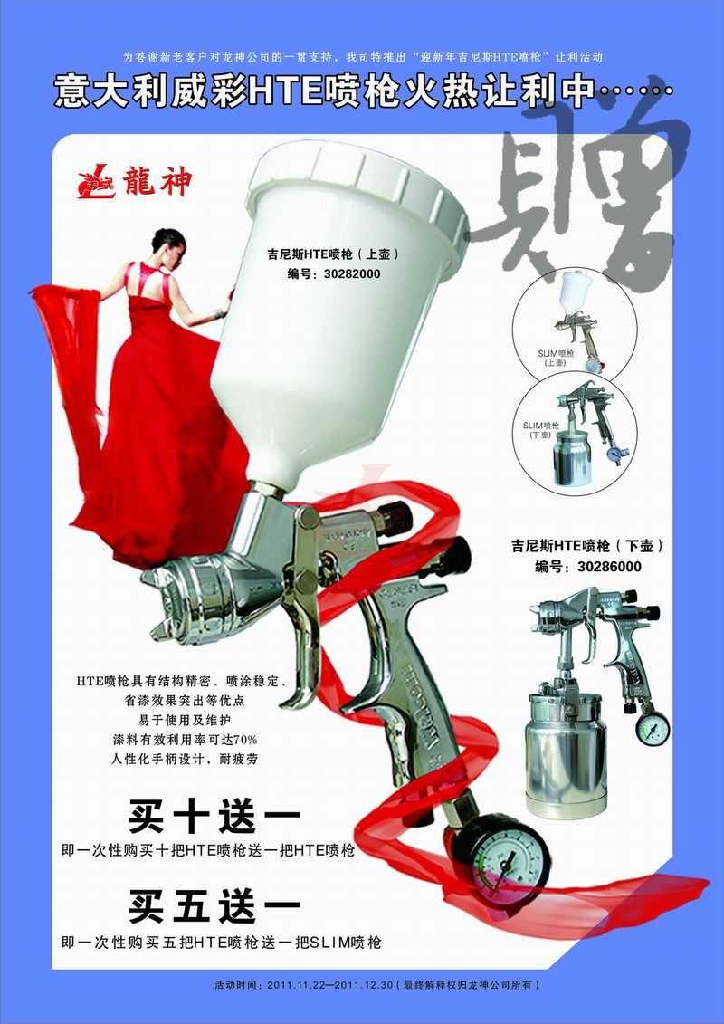 吉尼斯HTE噴槍11月促銷 吉尼斯HTE噴槍2011年11月促銷 (活動已結束,感謝您的關注) 一、主題: 吉尼斯HTE噴槍讓利促銷 二、活動目的: 讓利回饋給力促銷 三、活動時間: 1、 時間:2011年11月21日至2011年12月30日 2、 時長:共計40天 四、活動內容: 1、 買十送一(即一次購買十把HTE噴槍送一把HTE噴槍) 2、 買五送一(即一次購買五把HTE噴槍送一把SLIM噴槍) 市場部 2011年11月17日 宣傳海報 2011-11-19 12846