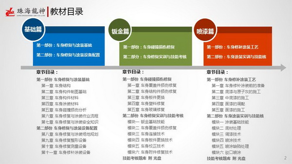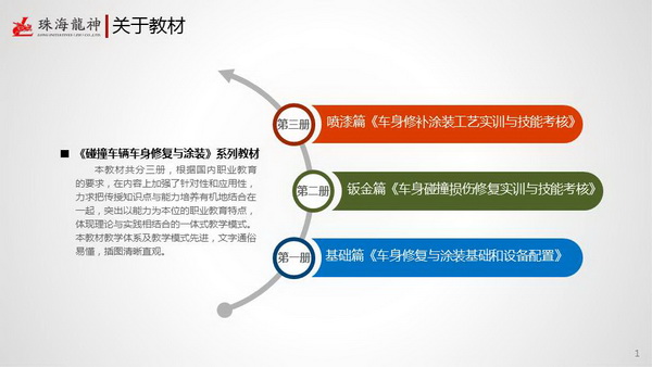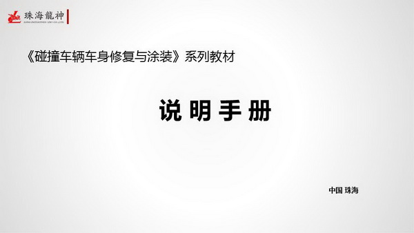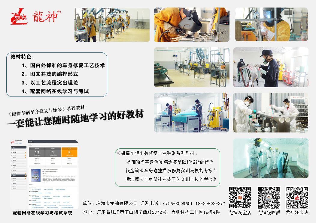 珠海市龍神有限公司2014年隆重巨獻《碰撞車輛車身修復(fù)與涂裝》系列教材:基礎(chǔ)篇《車身修復(fù)與涂裝基礎(chǔ)和設(shè)備配置》、鈑金篇《車身碰撞損傷修復(fù)實訓與技能考核》、噴漆篇《車身修補涂裝工藝實訓與技能考核》。