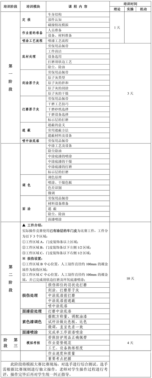 整個(gè)培訓(xùn)課程分三個(gè)階段,其中第一階段先按車身修復(fù)的基本工藝驟步培訓(xùn),時(shí)間約為10天;第二階段則以競賽項(xiàng)目專項(xiàng)培訓(xùn),時(shí)間也為10天;第三階段主要以模擬大賽現(xiàn)場,進(jìn)行綜合強(qiáng)化訓(xùn)練。詳情見下表: