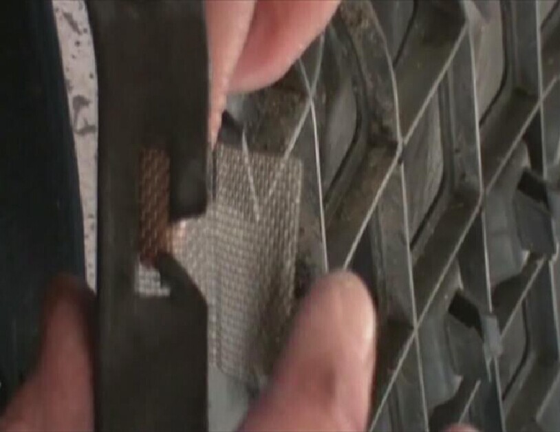 步驟6:把烙鐵按壓在加固網(wǎng)上加熱,并保持一定時(shí)間,使熔化的塑料將無(wú)銹加固網(wǎng)完全覆蓋,如圖1-6所示。注意要使覆蓋在無(wú)銹加固網(wǎng)周邊和折邊的熔膠具有一定厚度。