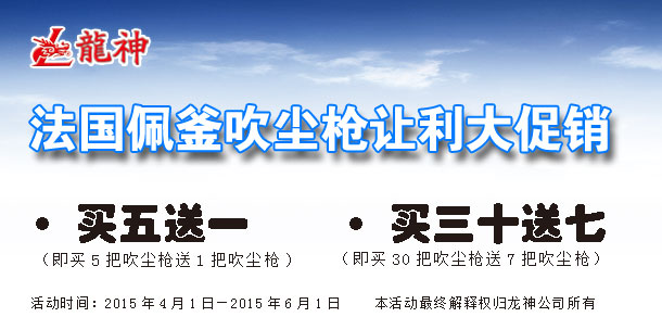 史無(wú)前例:法國(guó)佩釜吹塵槍讓利大促銷(xiāo) 2015-05-15 44439 “爽一夏”行動(dòng);回饋新老客戶(hù),讓利大回饋。史無(wú)前例,點(diǎn)擊查看。。。