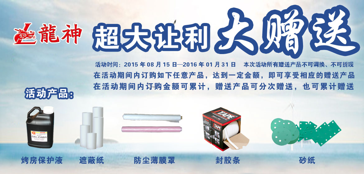 超大讓利﹒大贈(zèng)送 2015-08-17 31926 訂購(gòu)產(chǎn)品:1、烤房保護(hù)液; 2、遮蔽膜; 3、遮蔽紙; 4、泡沫膠條; 5、砂紙。 在活動(dòng)期間內(nèi)訂購(gòu)如上任意產(chǎn)品,達(dá)到下表累計(jì)金額,即可享受相應(yīng)的贈(zèng)送產(chǎn)品。
