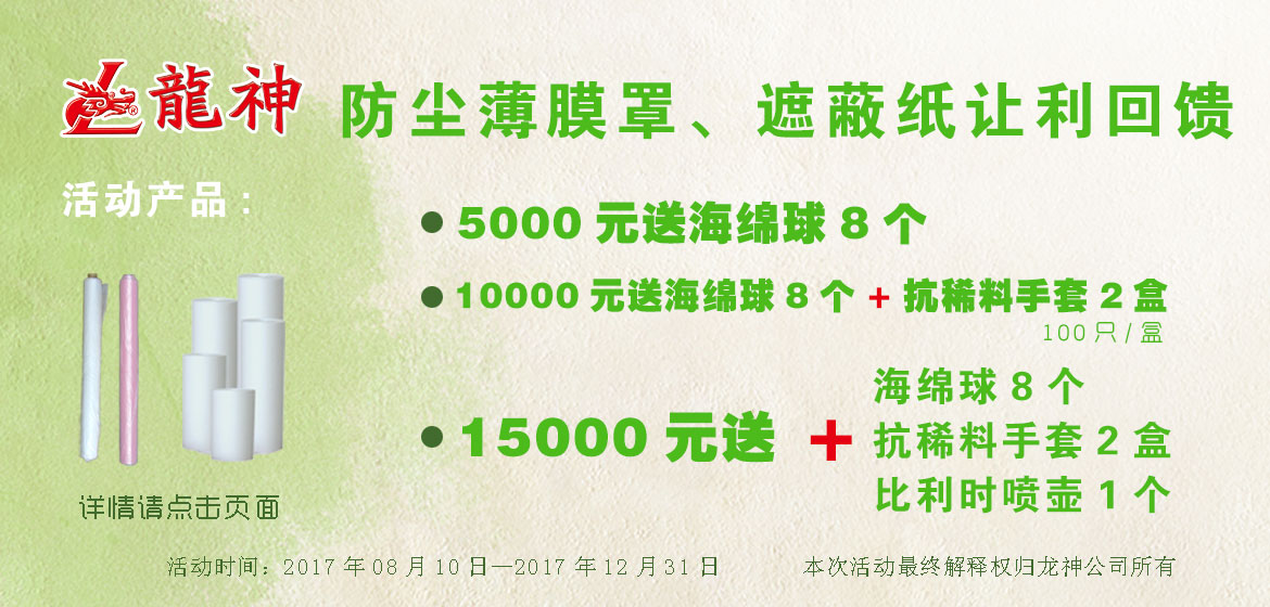 夏季讓利大回饋,遮避膜優(yōu)惠大促銷(xiāo) 2015-06-05 30206 買(mǎi)滿(mǎn)3000元,贈(zèng)送紙漏斗500個(gè); 買(mǎi)滿(mǎn)5000元,贈(zèng)送除漆洗手膏1箱; 買(mǎi)滿(mǎn)8000元,贈(zèng)送標(biāo)準(zhǔn)抹塵布1箱/24盒; 買(mǎi)滿(mǎn)10000元,贈(zèng)送小切紙架1臺(tái) 。